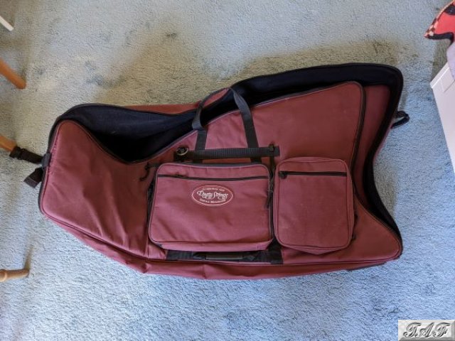 The harp comes with a carry case with multiple straps and pockets, with all zips and pockets functioning (pictured). It also has a detachable stool/stand that can be used to increase it's height (not pictured) and a tuning key.