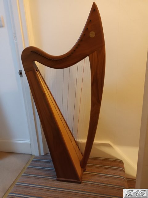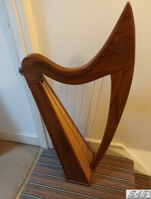 Beautifull like new folk harp used only briefly by a beginner who is not musical. It comes with a soft black case, tuner and a beginners book (teach yourself to play the harp) It stands 50inches/ 128cms tall at the highest point. It has a beautiful sound.
